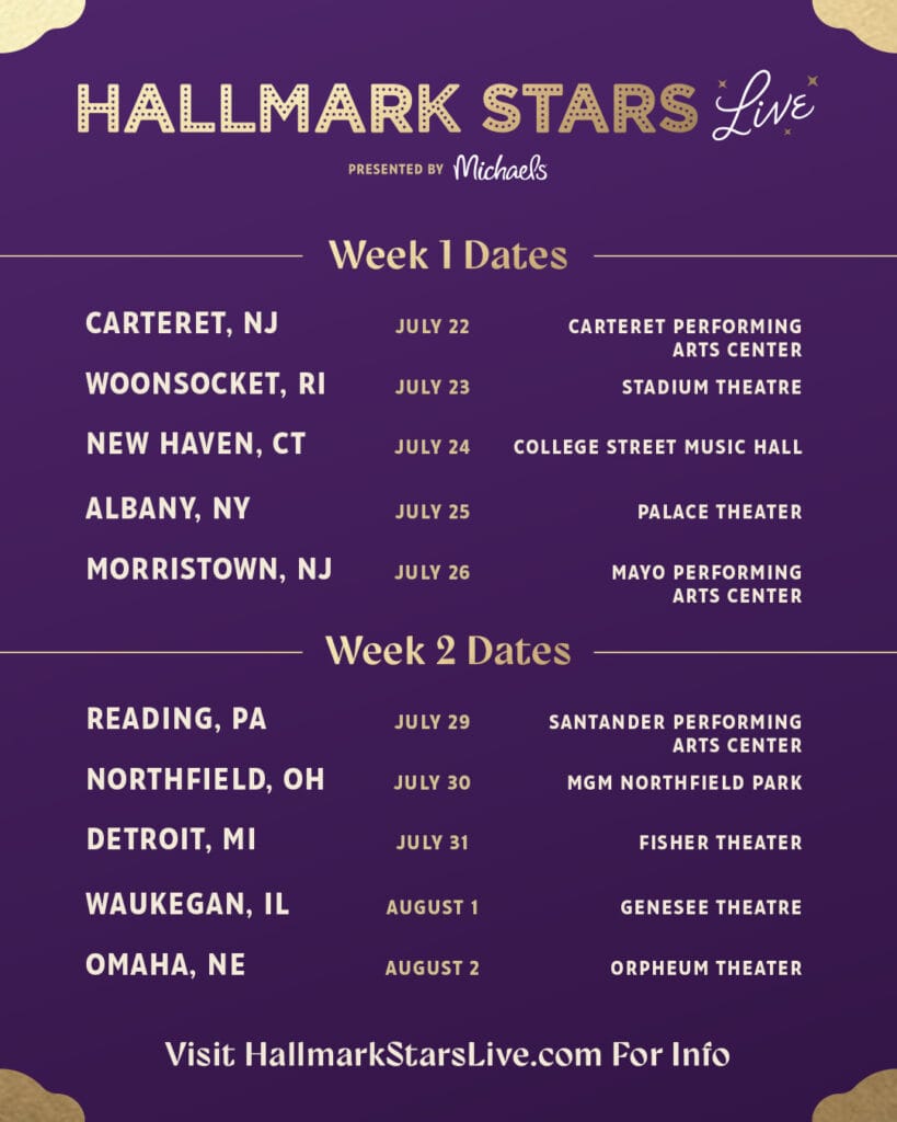Hallmark Stars Live is the network’s first-ever live fan tour, running July 22 through August 2, 2026. Presented by Michaels, the show gives fans 90 unscripted minutes with some of the most familiar faces from Hallmark movies. Hosted by Nikki DeLoach, the tour makes 10 stops across the Northeast, mid-Atlantic, and Midwest.